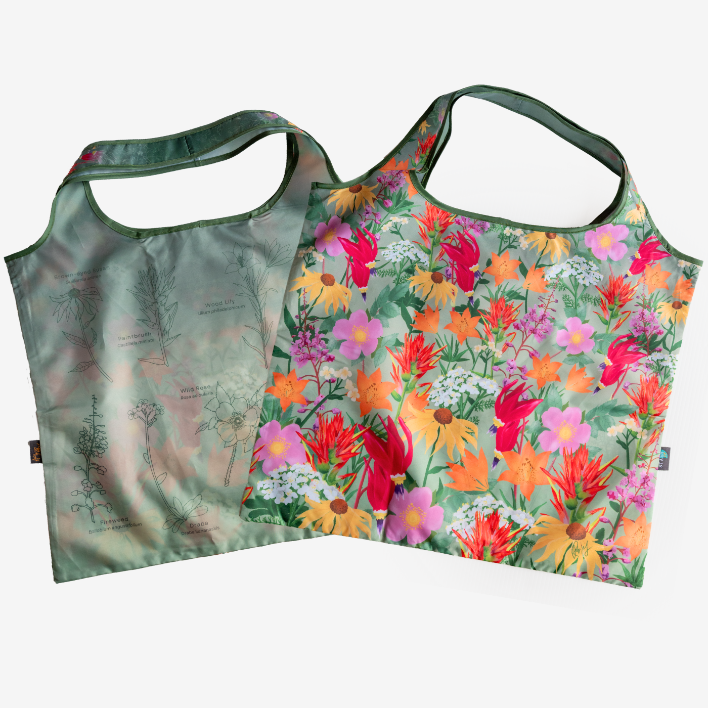 The reverse side offers a more educational view, with scientific-style line drawings of each flower, clearly labelled with their names. Together, the designs balance expressive artwork with botanical detail, making the bag both eye-catching and informative.