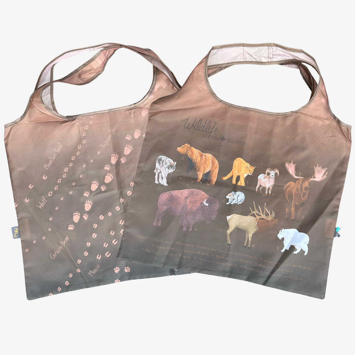 This tote bag celebrates the iconic wildlife of the Rocky Mountains. One side features a collection of Rocky Mountain animals, each shown with their scientific name and typical land speed, offering a fascinating glimpse into how these species move through their environment.